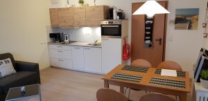 Zur freundlichen Einrichtung gehört eine praktisch nutzbare Küchenzeile mit Essplatz, Wohnbereich mit neuem Leder-Schlafsofa, das für 2 Personen zum Schlafen einfach ausgeklapptwerden kann, einem Flachbildfernseher und Radio, sowie ein Safe.